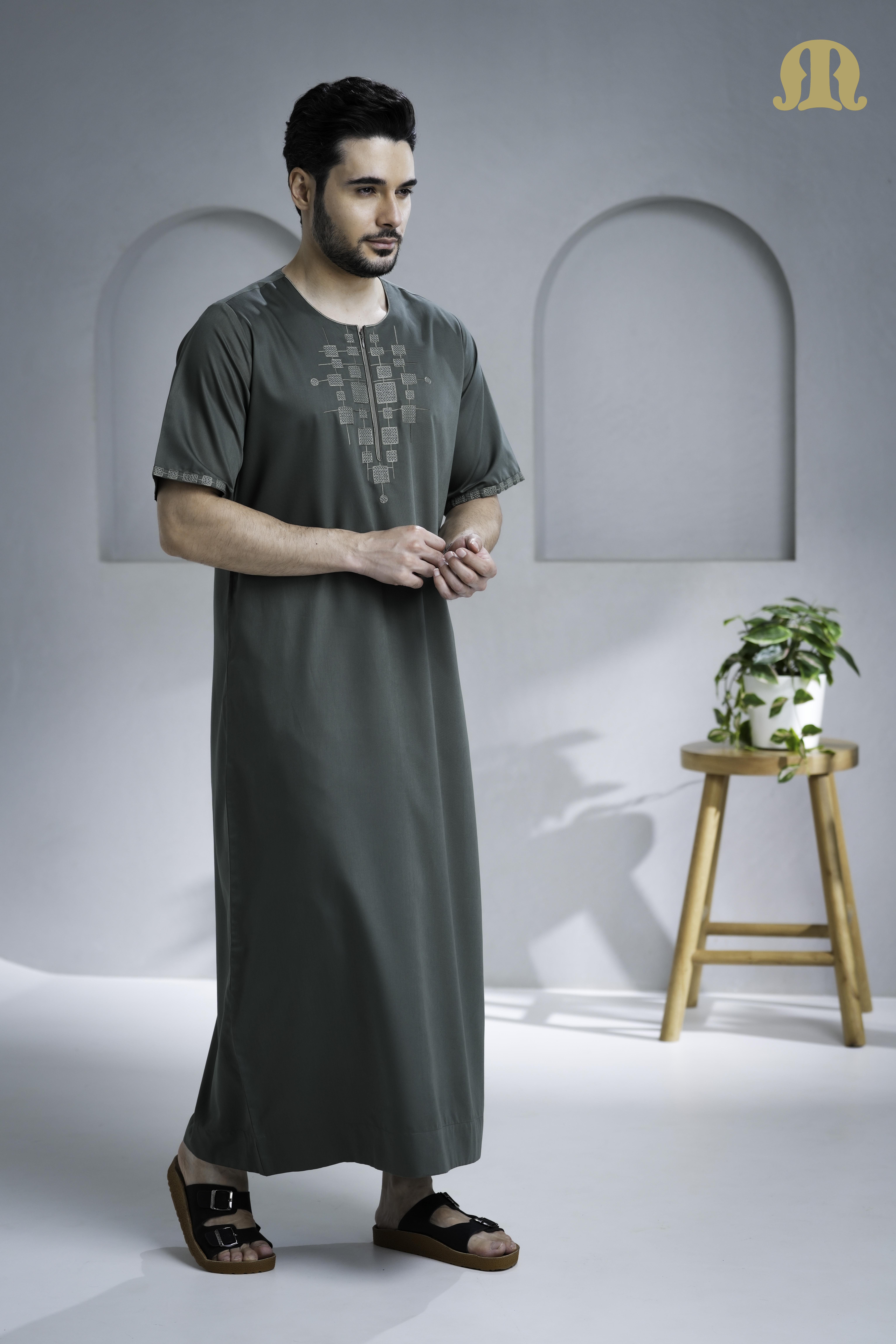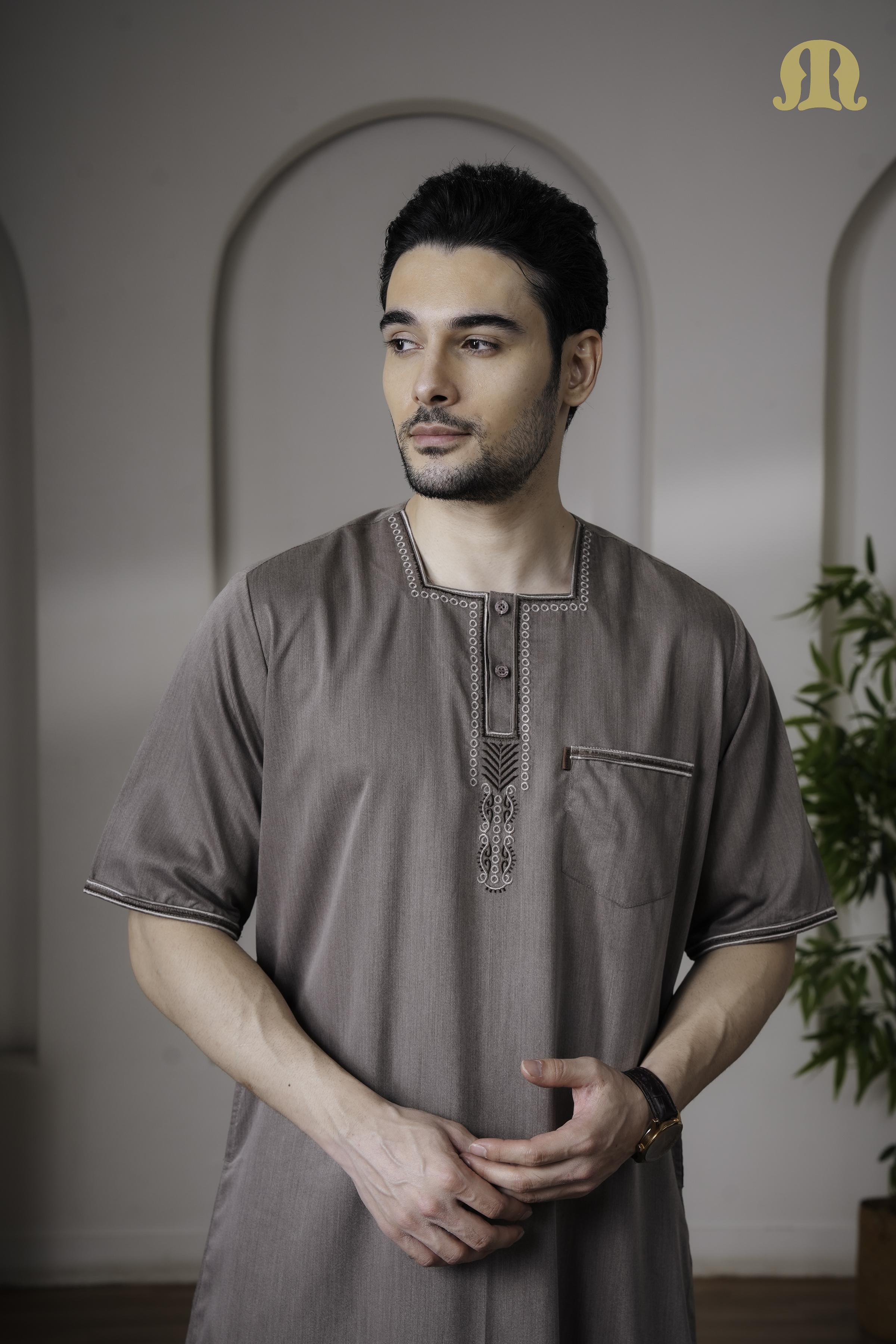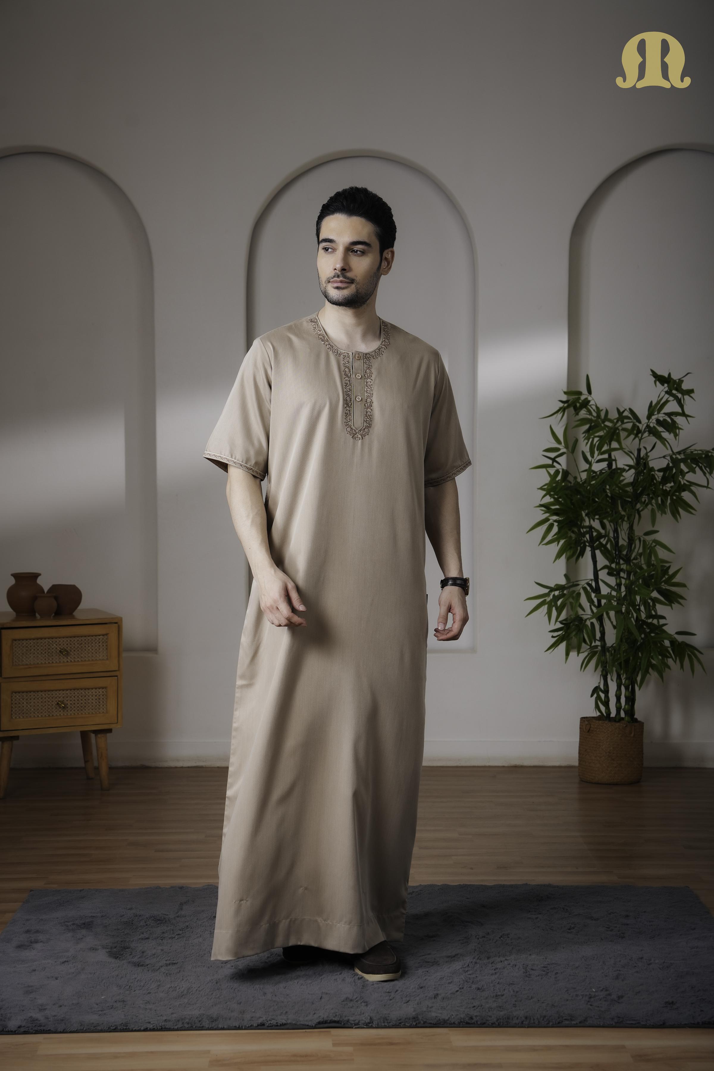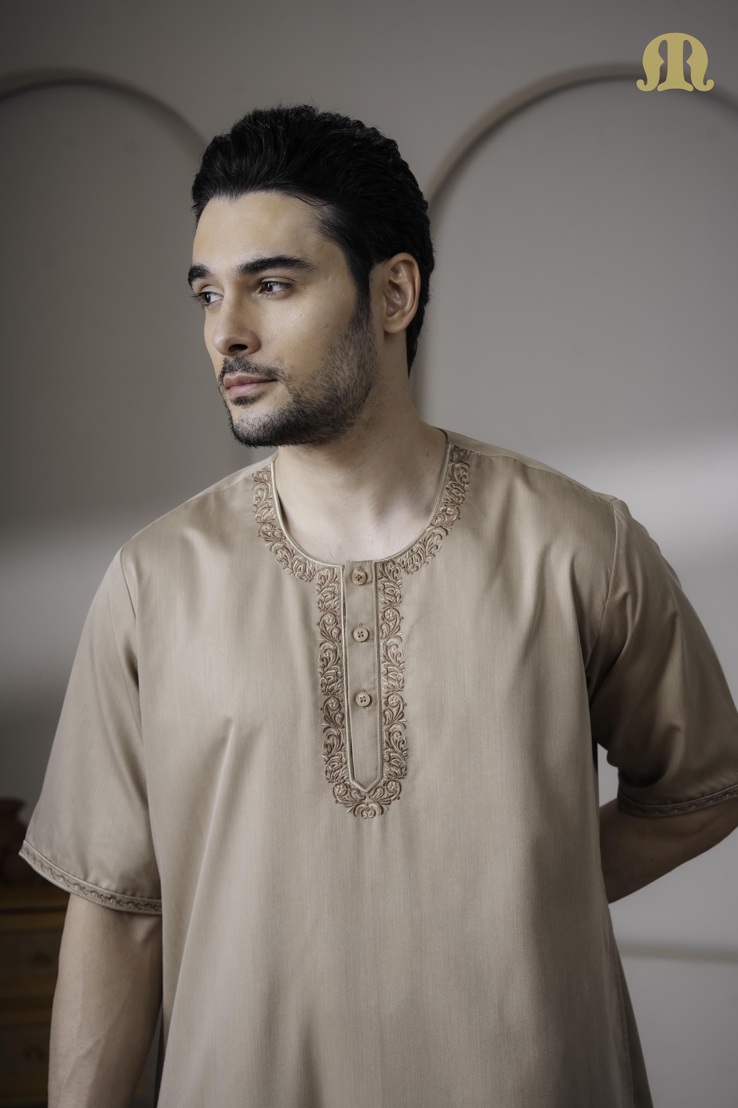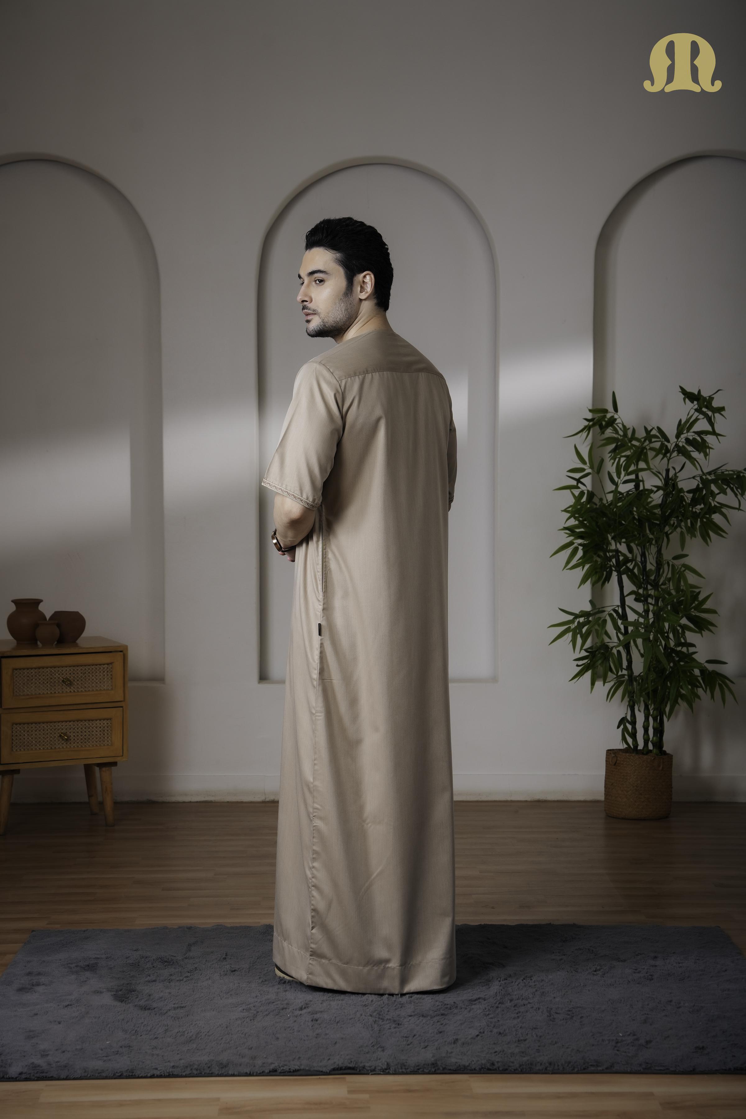 Designed for comfort with refined detailing, this Beige Andak Half Sleeve Thobe offers a perfect balance of practicality and traditional elegance. Its clean, streamlined silhouette ensures ease of movement, making it ideal for everyday wear in all climates. Crafted from premium Poly Viscose fabric, the thobe combines the breathability of cotton with the durability and wrinkle resistance of polyester. The result is a lightweight, easy-to-maintain garment that stays comfortable and presentable throughout the day. The design is elevated by an embroidered, adding a touch of sophistication, while embroidered sleeves enhance the overall look with subtle craftsmanship. The half sleeves provide a relaxed, contemporary feel without compromising modesty or style.