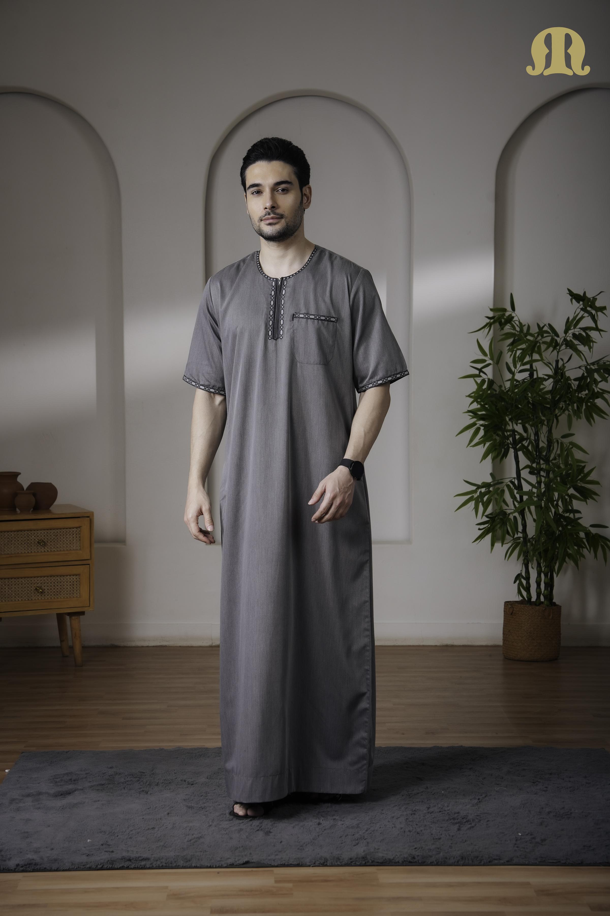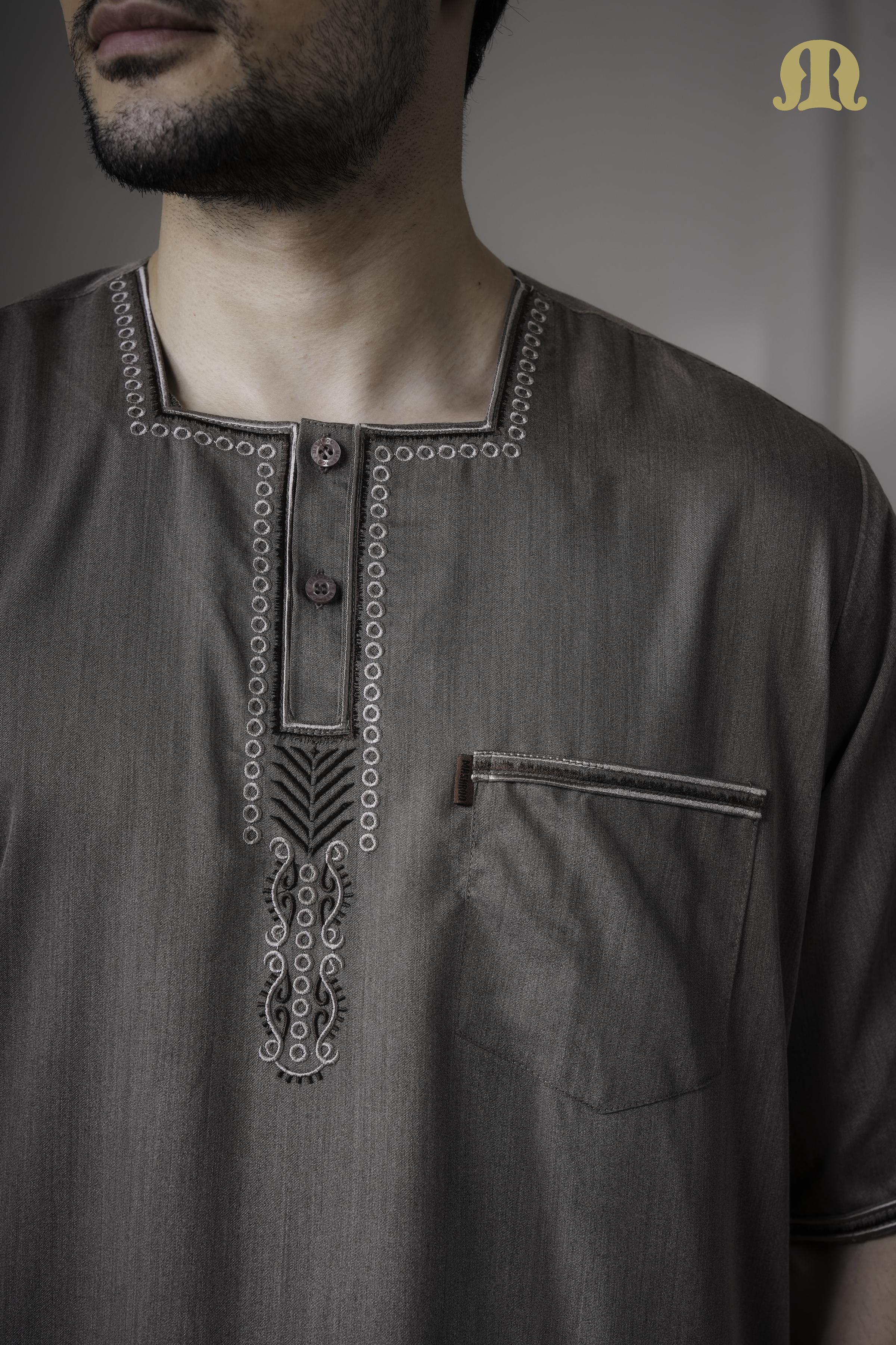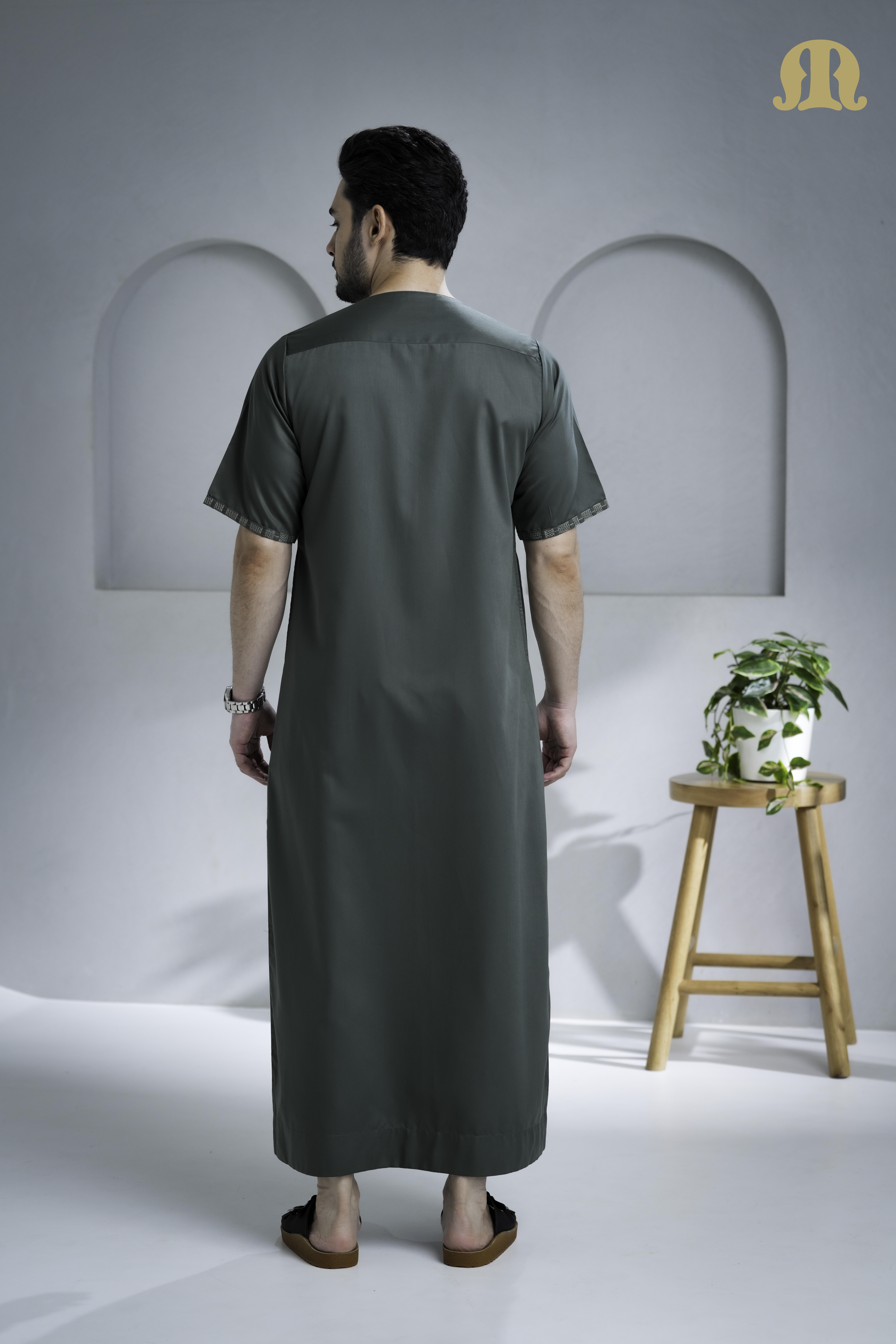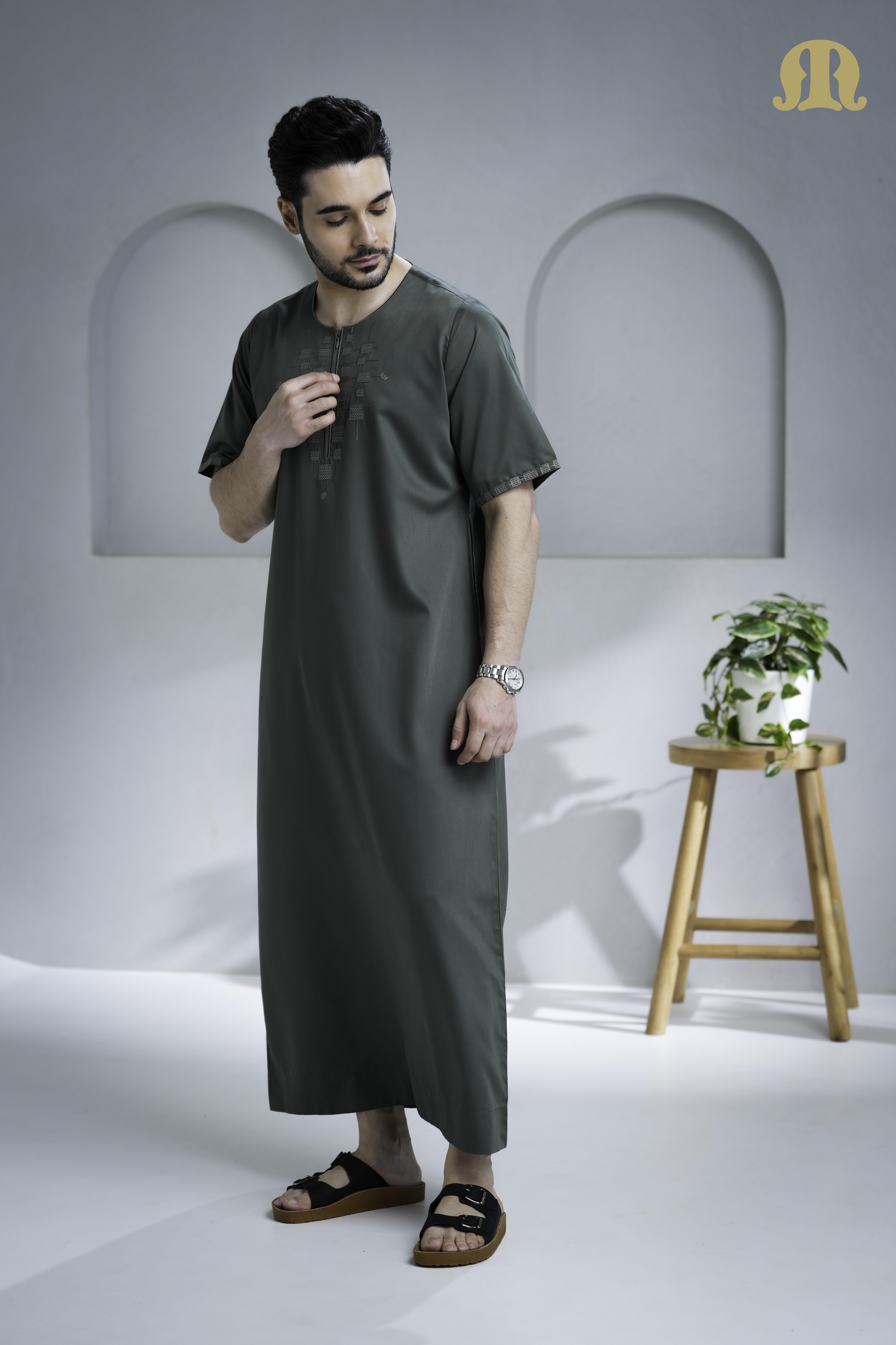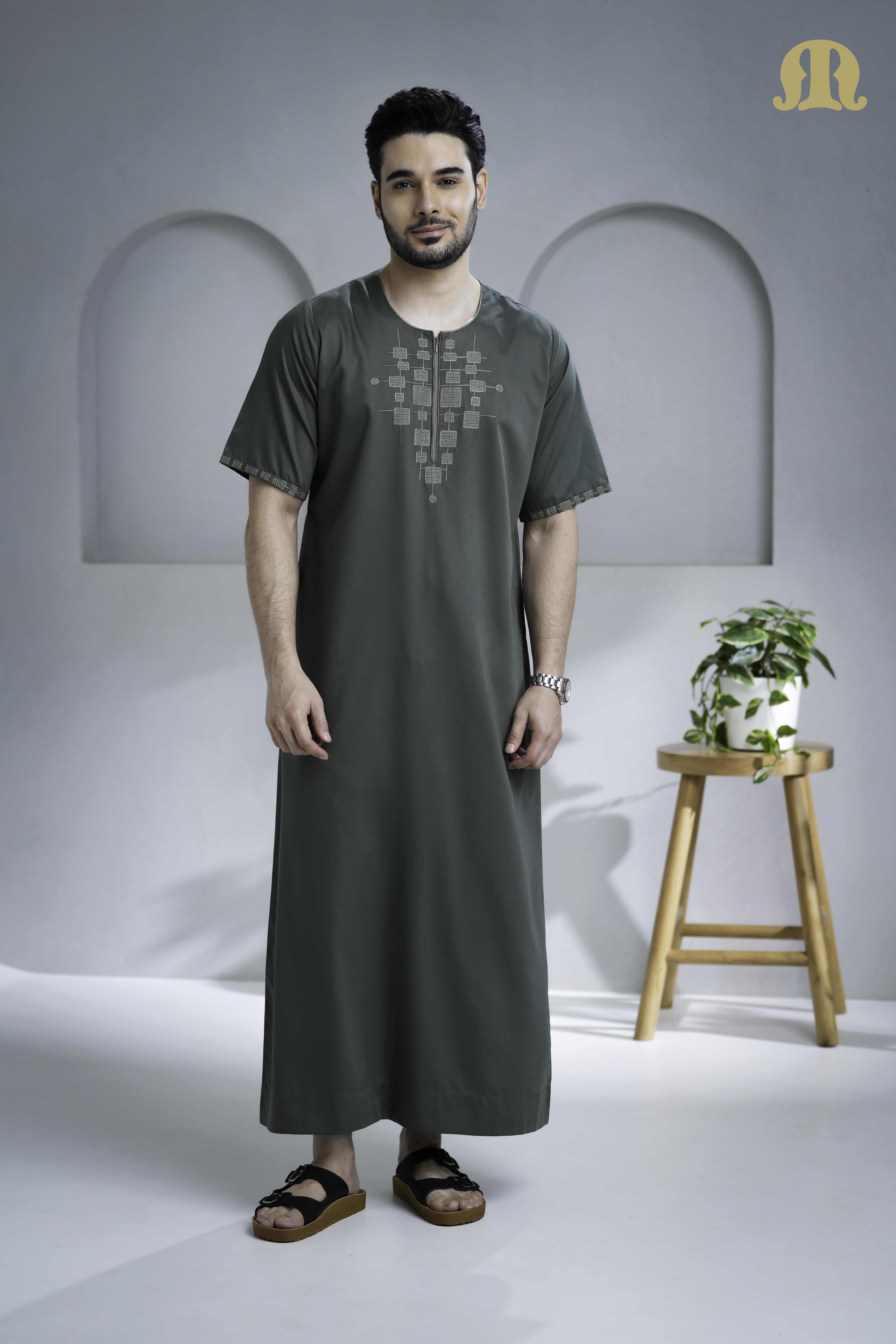 Designed for comfort with refined detailing, this Beige Andak Half Sleeve Thobe offers a perfect balance of practicality and traditional elegance. Its clean, streamlined silhouette ensures ease of movement, making it ideal for everyday wear in all climates. Crafted from premium Poly Viscose fabric, the thobe combines the breathability of cotton with the durability and wrinkle resistance of polyester. The result is a lightweight, easy-to-maintain garment that stays comfortable and presentable throughout the day. The design is elevated by an embroidered, adding a touch of sophistication, while embroidered sleeves enhance the overall look with subtle craftsmanship. The half sleeves provide a relaxed, contemporary feel without compromising modesty or style.