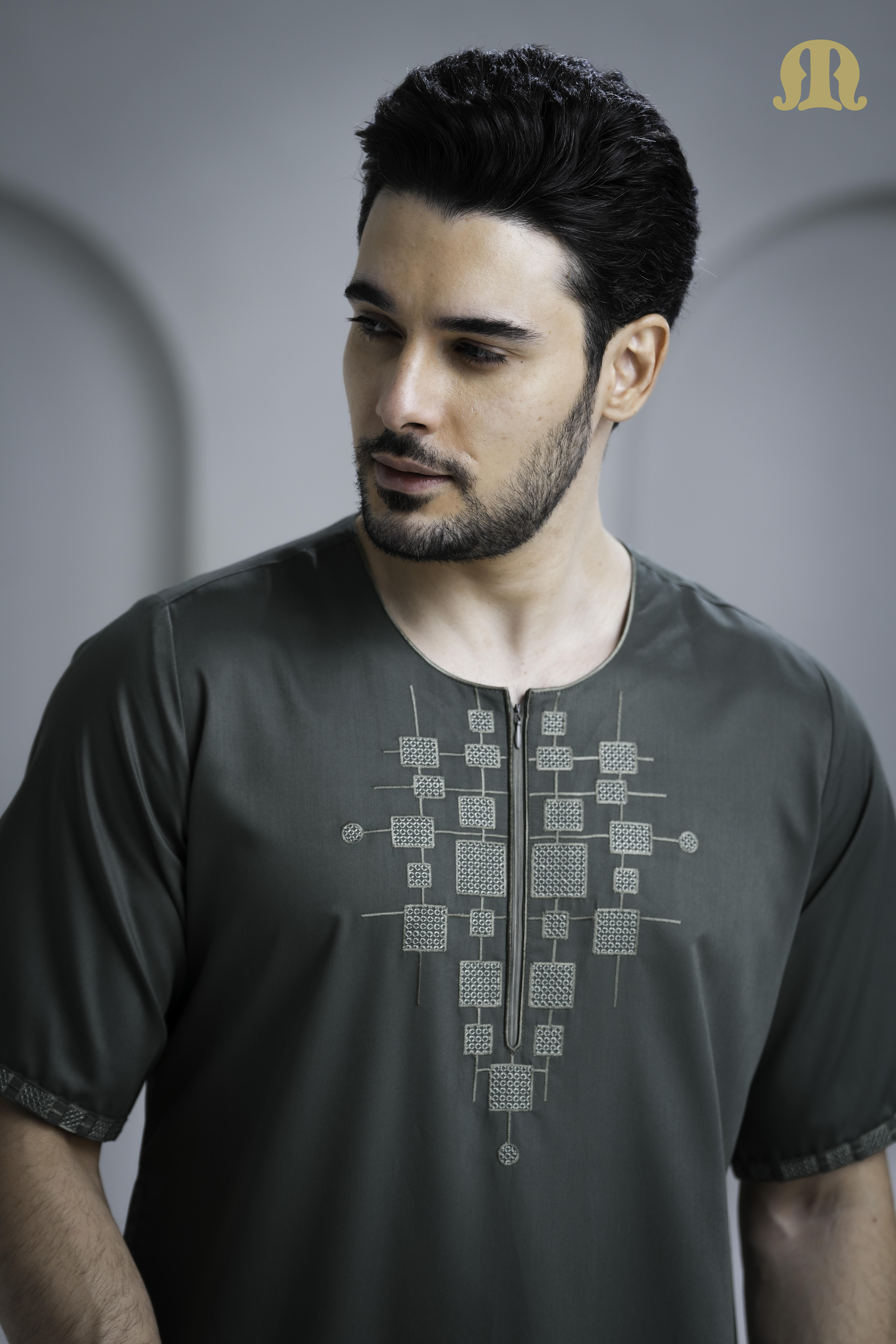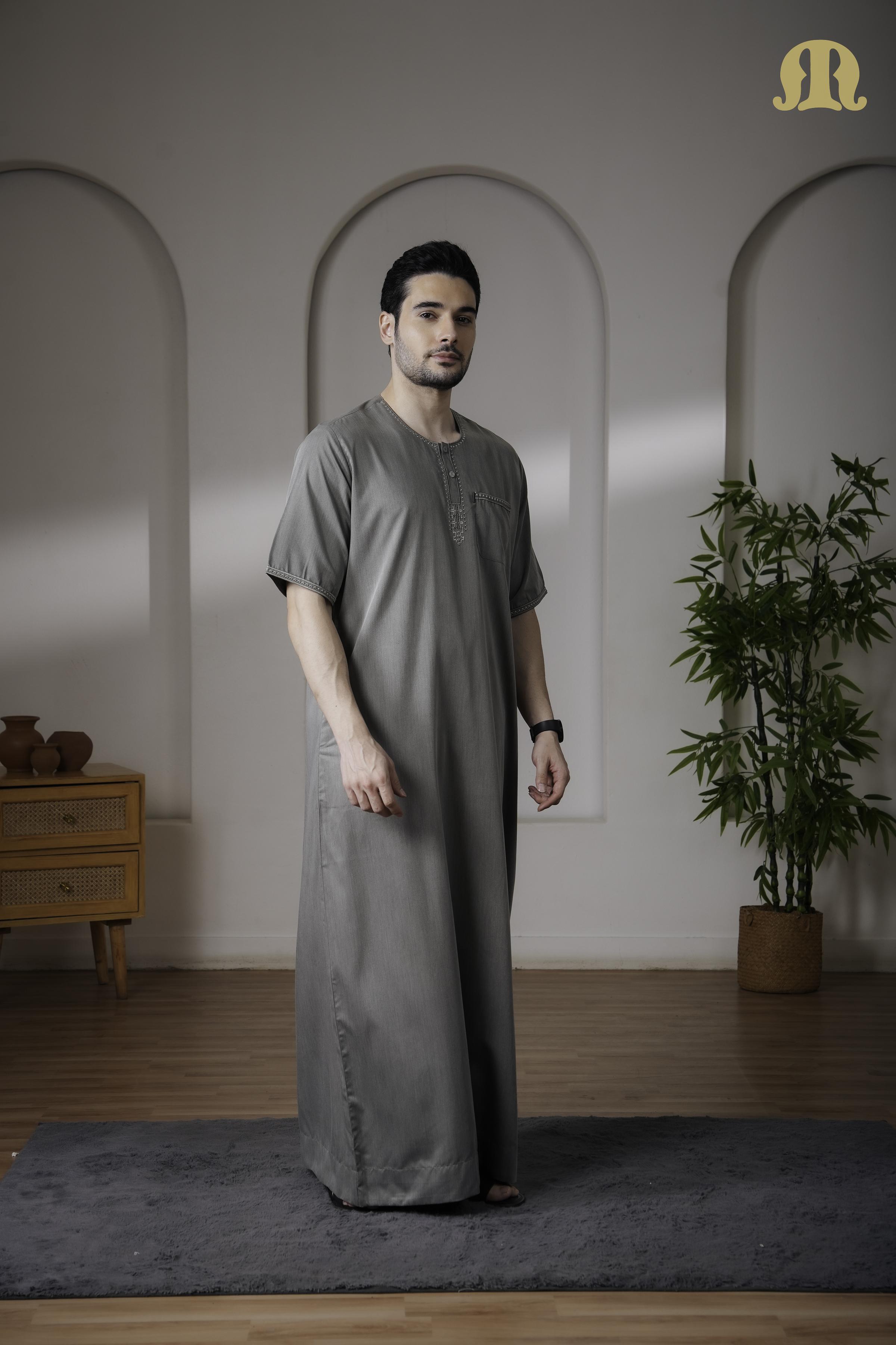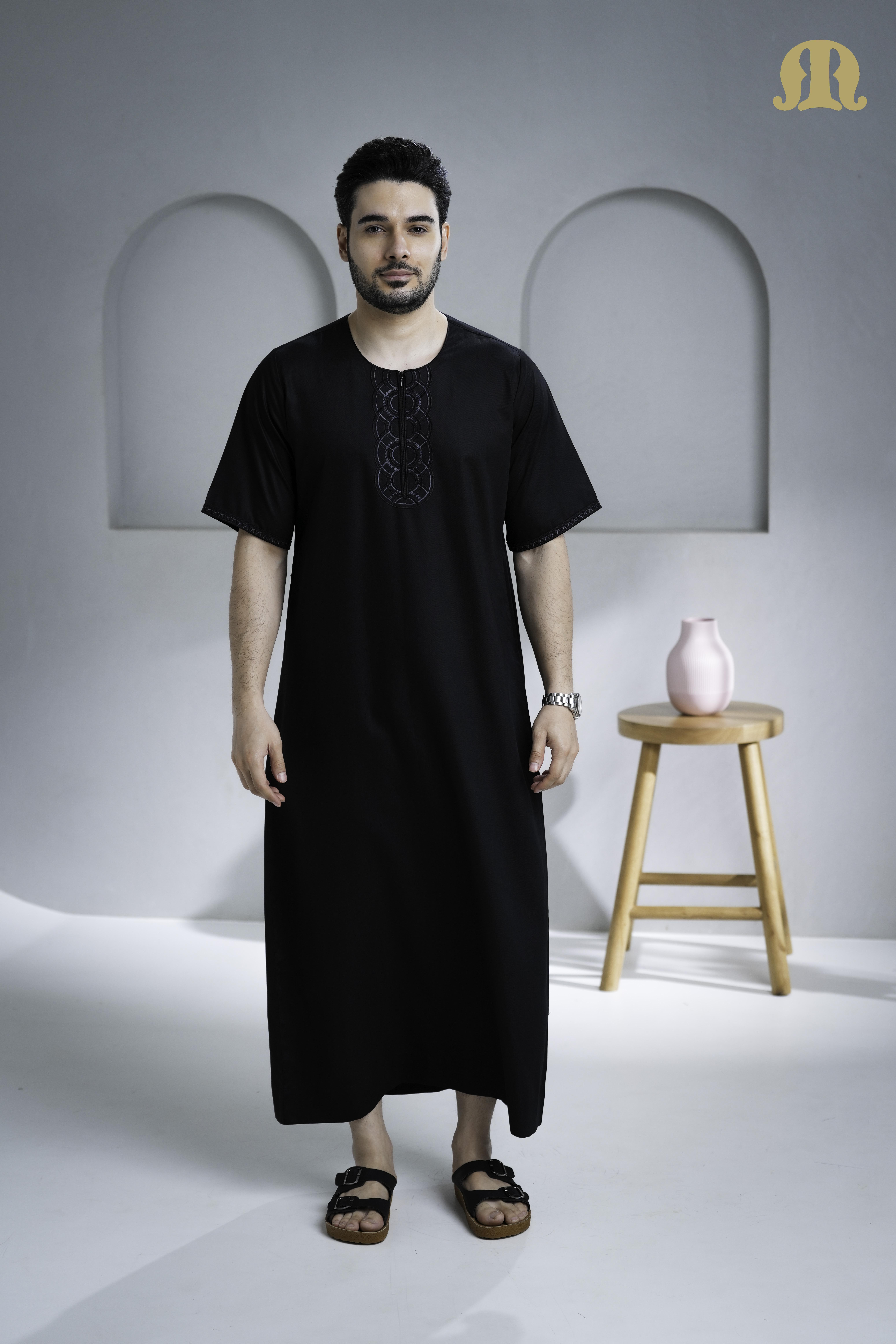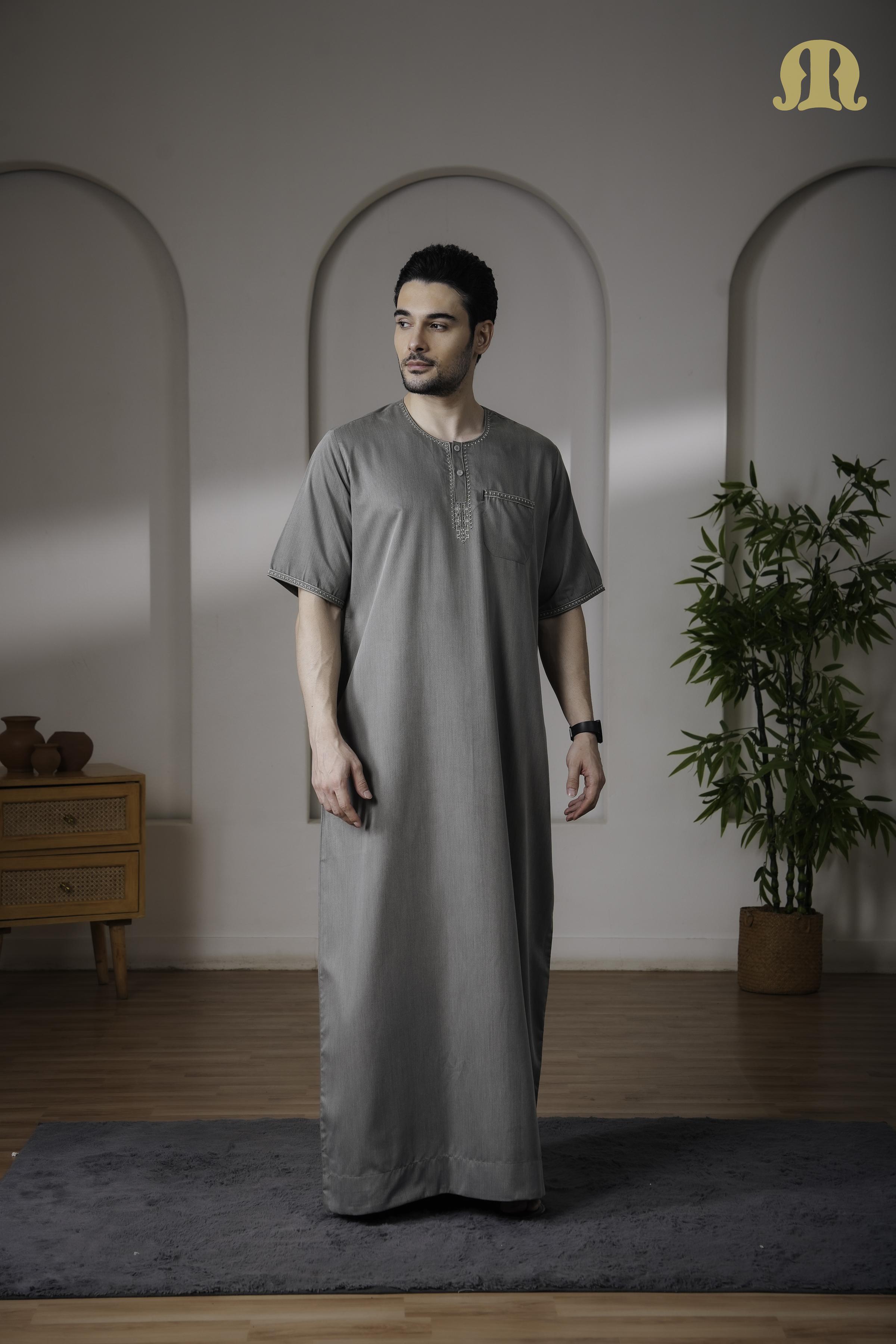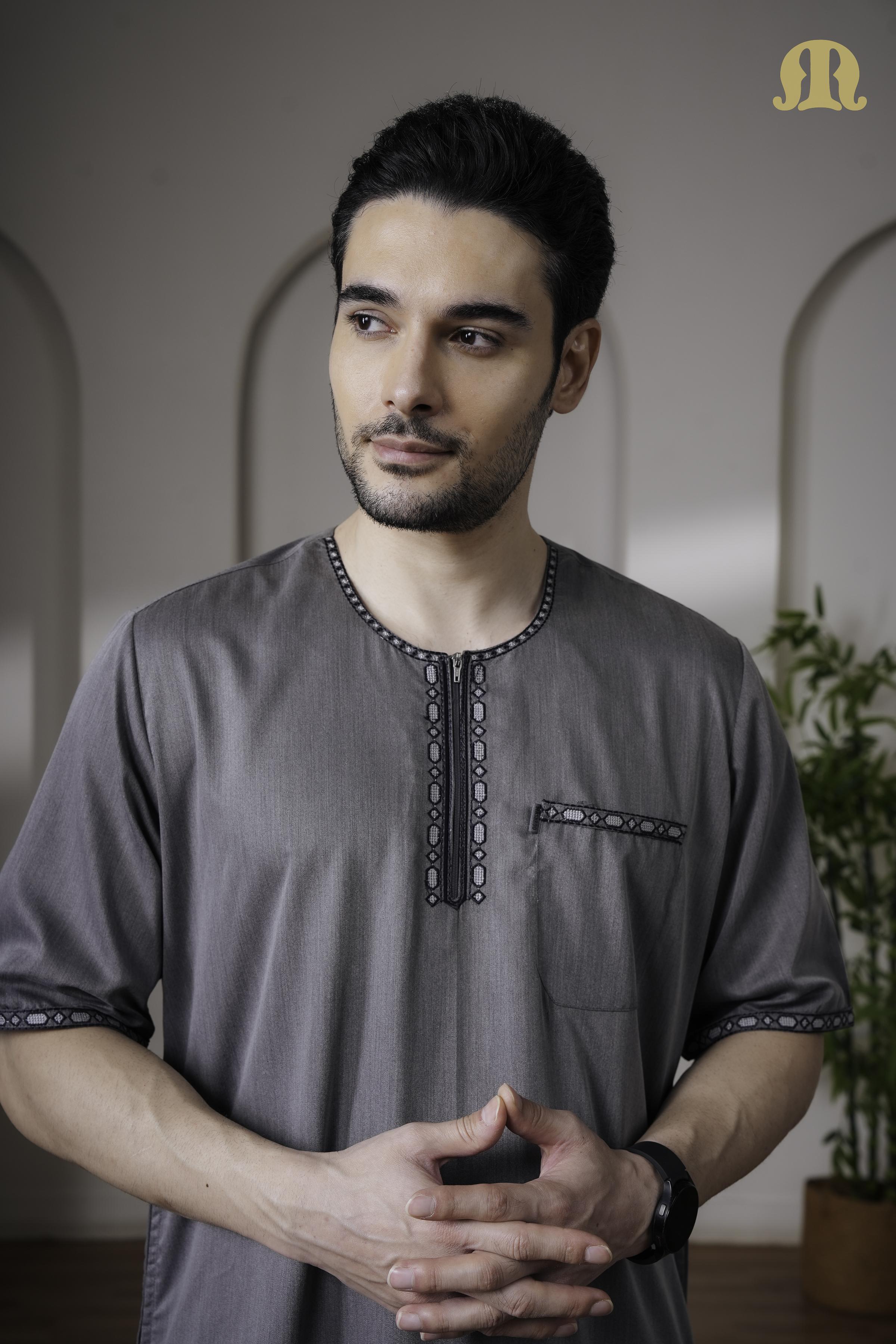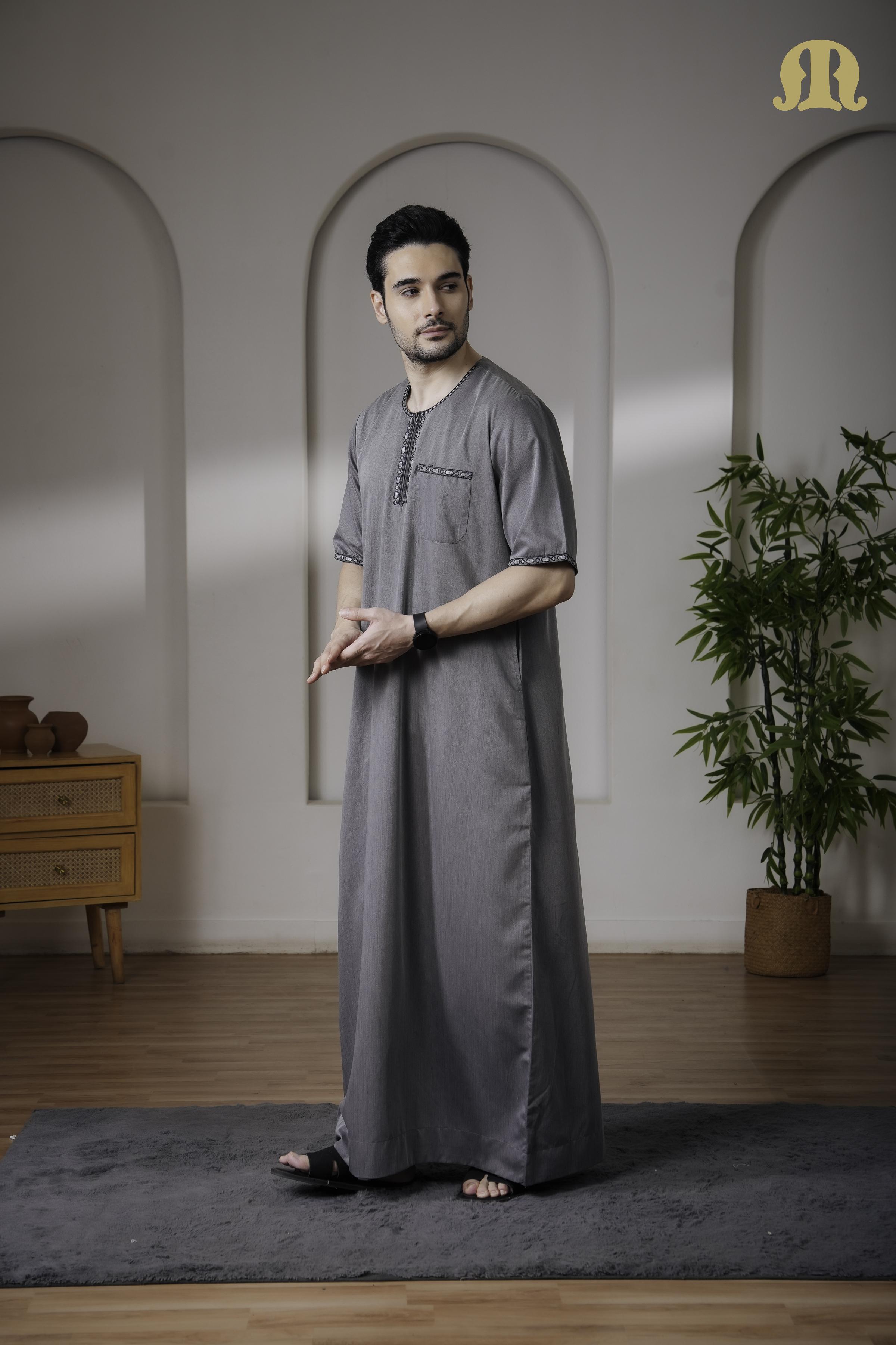 Designed for comfort with refined detailing, this Beige Andak Half Sleeve Thobe offers a perfect balance of practicality and traditional elegance. Its clean, streamlined silhouette ensures ease of movement, making it ideal for everyday wear in all climates. Crafted from premium Poly Viscose fabric, the thobe combines the breathability of cotton with the durability and wrinkle resistance of polyester. The result is a lightweight, easy-to-maintain garment that stays comfortable and presentable throughout the day. The design is elevated by an embroidered, adding a touch of sophistication, while embroidered sleeves enhance the overall look with subtle craftsmanship. The half sleeves provide a relaxed, contemporary feel without compromising modesty or style.
